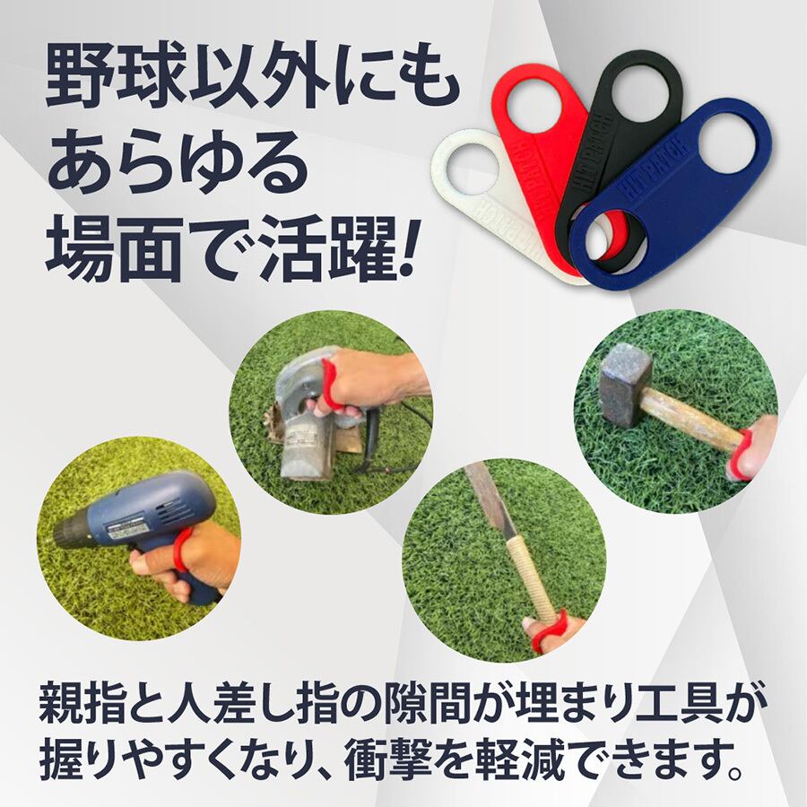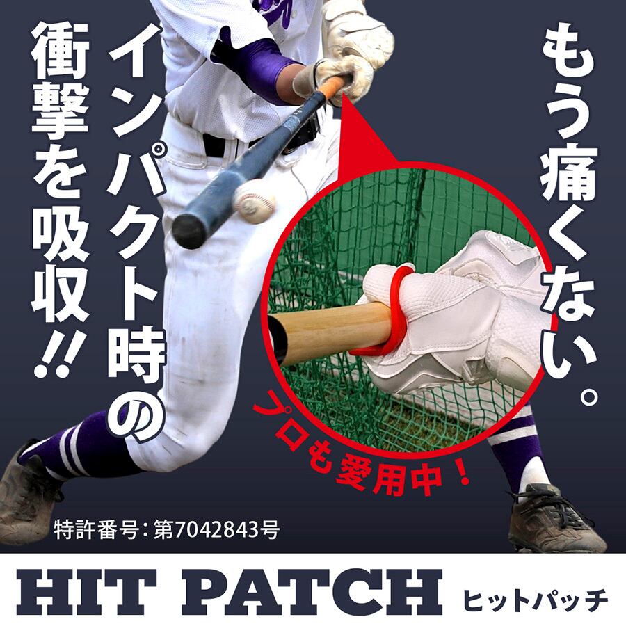 HIT PATCH(ヒットパッチ)は、野球やソフトボールのバッティングの際にインパクト時の衝撃を和らげ、手を保護する目的で日本で開発されたアイテムです。また、ヒットパッチは丈夫なシリコンを使用しているため、耐久性に優れ汚れにも強く、ヒットパッチがバットと手の間に生じる隙間を埋めることで、しっかりとグリップすることができます。しっかりとグリップすることで、故障の予防につながるとともに、インパクトの時にもパワーロスせず振りぬけるのでスイング軌道の安定に繋がります。